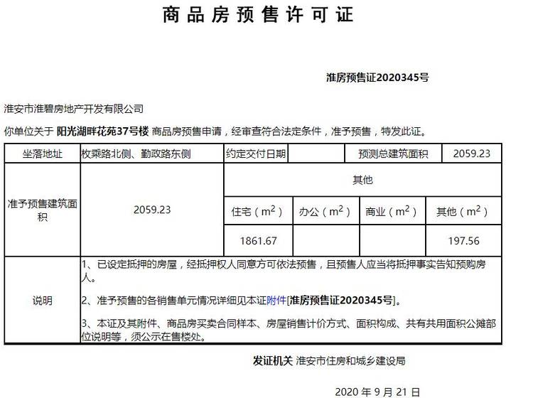 - 淮房预售证2020345号 详情发证时间 2020-09-21绑定楼栋37号楼证件照片