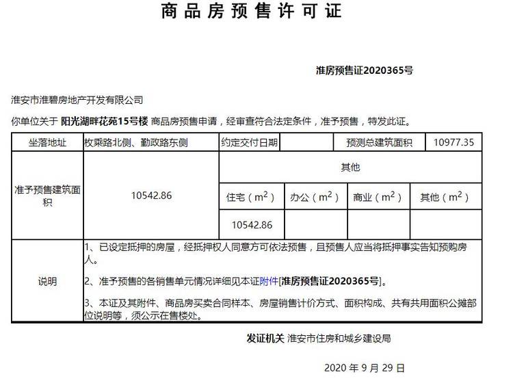 - 淮房预售证2020365号 详情发证时间 2020-09-29绑定楼栋15号楼证件照片