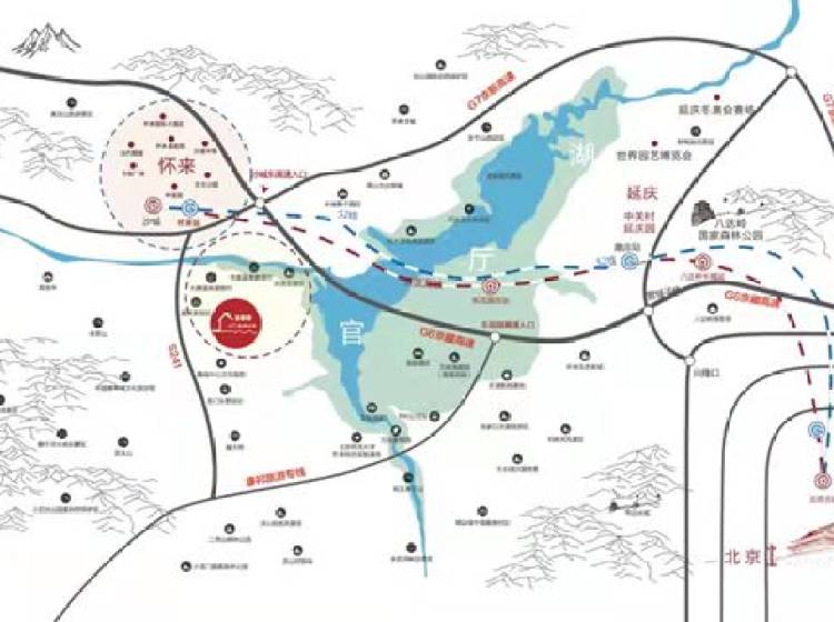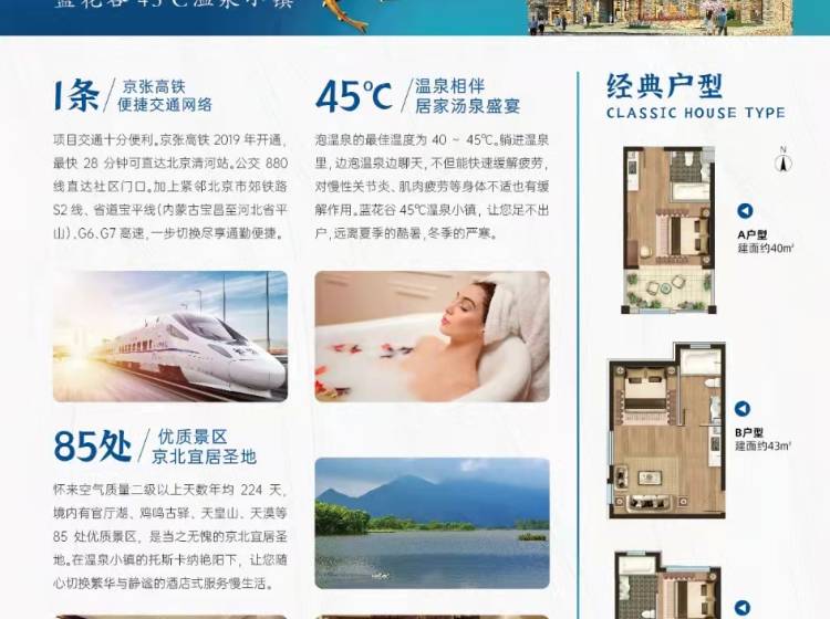 【项目卖点】 2019年延庆世界园博会和2022年冬奥会辐射核心区域 三条高速(G6京藏、G7京新、京礼高速)两条铁路(京张高铁、S2城际)小区门口市政公交880直达北京 距离怀来县城大型配套商圈,医院,学校仅5公里 距离高速入口、高铁站仅14公里范围,交通便捷,环境优越生态:超60%森林覆盖率空气质量优质天数320天以上景点:30分钟车程圈尽享85个旅游景点,项目对面老君山景区(滑雪场,等山公园,房车露营基地等)小区步行5分钟可达官厅湿地公园。养生:温泉入户,项目的温泉是华北地区唯一的火山温泉,含28种矿物元素,多项指
