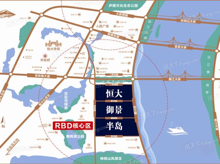 恒大御景半岛, 是世界500强企业恒大集团进驻吉安继恒大帝景后推出的又一重磅作品。 项目鼎立吉安新城, 雄踞干里赣江之滨, 坐拥城市一线江景资源; 享一站式生活配套, 启幕缤纷江岸生活: 周边拥有两纵三横" 发达路网, 可畅达都市生活圈, 瞬间切入城市繁华。 恒大御景半岛总建筑面积约42万㎡, 传承原生态简欧建筑精髓,匠造约50000㎡欧陆景观园林, 与干里江景交相辉映; 约4000㎡璀璨商业配套, 约1000㎡综合功能会所、 约2900㎡菁式9班制幼儿园等生活配套礼遇新时代城居文明; 倾力打造建筑面积约96-141㎡瞰景高层, 约113-146㎡江景洋房, 全装修交付, 以匠心雕琢品质生活; 金碧物业, 24小时英式管家, 细心呵护。 恒大御景半岛, 凝聚恒大21年经验之大成, 以恢弘气度, 荣耀呈世。 繁华之上, 打造时代经典, 开启吉安品质人居的新篇章!