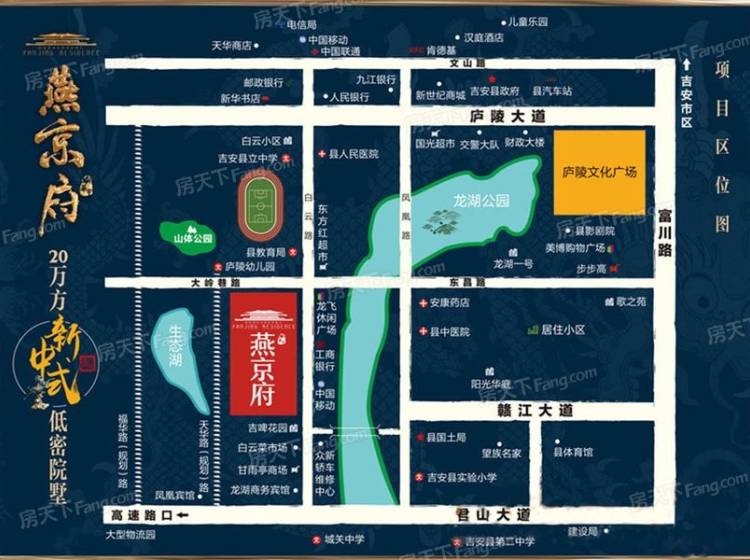 庐陵政心之上、城市龙脉之巅、只为纵横天下!【燕京府】承袭千年庐陵文脉、打造城市的文化孤品,匠心打造新中式王府院墅大宅,只为献给影响世界的庐陵人!以20万㎡低密大盘划疆筑城、以定邦之势冠绝全城!首创108—145㎡墅质高层、230㎡花园电梯院墅,两梯两户、户户朝阳、南北通透、大面宽阳台等先进规划,只为王府贵族定制!毗邻幼儿园、县实验小学、城关中学、县立中学等优质文教圈,为孩子的教育提供高品质的教育名校,成就孩子美好未来。【燕京府】师承“万园之园”造景之法,以花草、灌木等高低错落构成了节奏清晰,富于变幻多重园林景观。纳藏大美胜境,敬献庐陵!