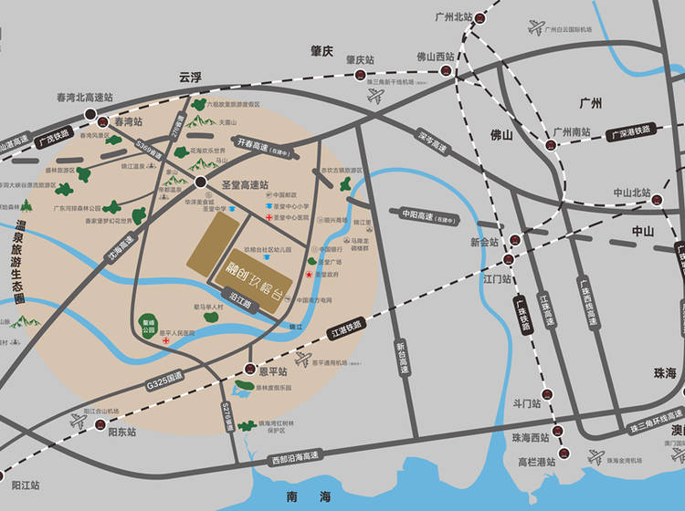 天工融创,开物大湾区旅居时代。融创恩平项目,位于素有中国温泉乡,同时也是中国著名侨乡的江门恩平圣堂镇。伴随着深茂高铁的开通,依托沈海高速、开阳高速等多条高速公路,项目凭借距离沈海高速圣堂出口约1.5公里的交通优势,率先融入湾区都市生活圈。