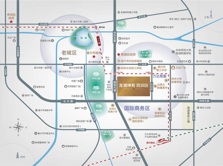 龙湖坤和朗润园,位于国际商务区正中央,主城环线内,嘉兴“国宾大道”商务大道旁,一步中央公园城市绿肺,无缝接驳高铁南站枢纽城市未来CBD。同时毗邻万达广场,近享城市商圈繁华万象。周边北师大附属高中、同济大学附属学校等名校环伺;市排名前列医院、妇幼保健院、凯宜国际医院(在建)等医疗资源环伺,揽全系醇熟生活配套。