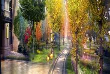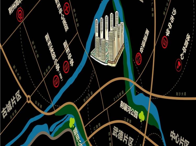 景湖美林悦府项目用地位于荆州沙市区沙北新区荆沙大道与楚都大道交界处,荆襄河外河两支流于此交汇,地块南临草市居民区,北临杨家庄城乡结合部,西临荆沙大道沿街商业带,东接两湖粮油大市场 项目地处两河交汇处,水体环绕,视觉开阔,自然条件良好。总体规划充分利用场地特征,以景观规划为先导,使生态景观与建筑、生活融为一体。利用景观作为基底联合住宅与公共设施两个部分,分别采用围合式规划布局,以小区中心景观及城市广场将其串连。建筑尽可能沿河而置,对外亲水近水,拥有良好的景观朝向,对内形成大绿化空间,为住户提供舒适的生活平台。