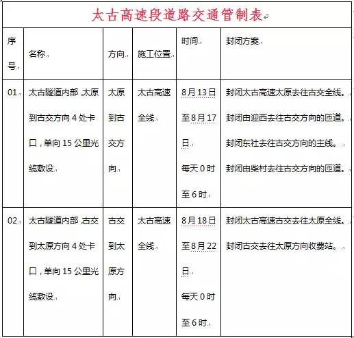 山西省公安厅交通管理局太古高速隧道交通秩序管控系统项目建设计划在2018年8月13日至8月17日,每日0时至6时在太古西山隧道太原去往古交方向安装卡口设备,在2018年8月18日至8月22日,每日0时至6时在太古西山隧道古交去往太原方向安装卡口设备。
