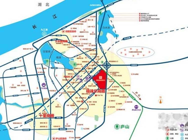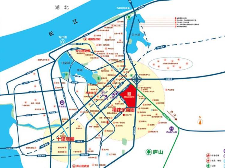 商场或超市:沃尔玛超市 医院:九江新中医院 其他:荷花垅高速收费站 九江汽车站 九江火车站 有11条公交线路直达项目 庐山机场 九江学院