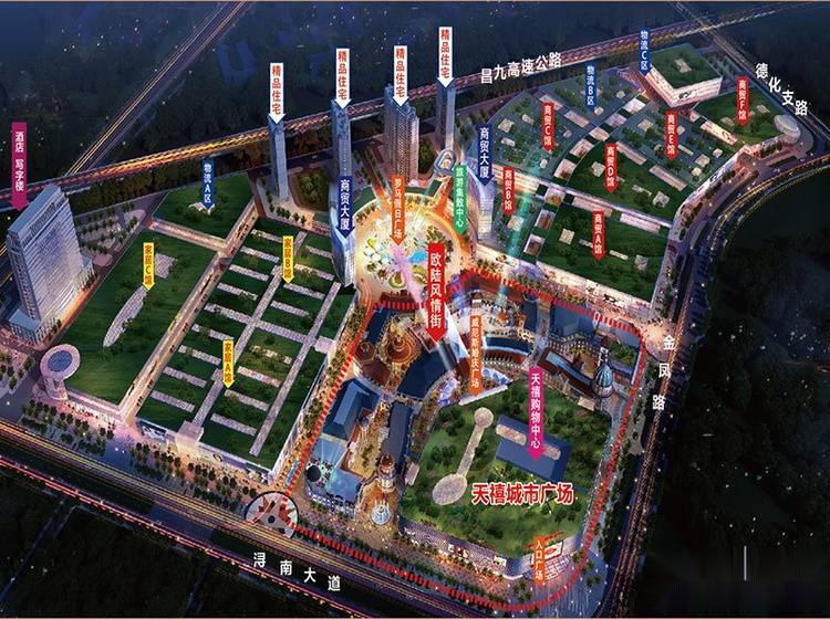 禧徕乐国际商业中心是由九江禧徕乐国际商业有限公司斥资40亿元恢弘筑造,项目地处金凤路与浔南大道交口(市长途客运站斜对面),占据九江城市发展大规划中轴正中心,是江西省重点项目。项目专属申请设立的庐山(禧徕乐)旅游集散中心强势落定,将与庐山互相借力,实现共赢。未来,禧徕乐定会如庐山一般,成为九江的名片! 禧徕乐国际商业中心总占地面积520亩,总建筑面积约76万㎡。76万㎡文旅综合体,由国际SHOPPING MALL、欧陆风情街、商贸、家居、物流、住宅、酒店和办公构成为一个都市超级商圈。