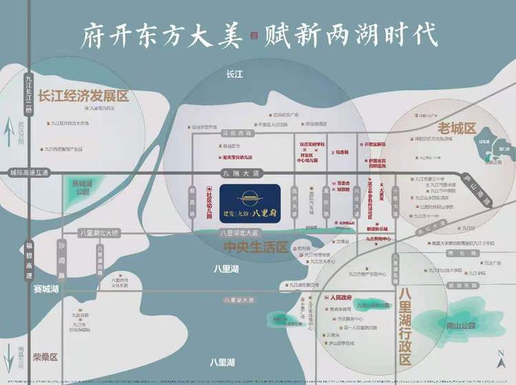 其他:项目位于开发区核心区与八里湖新区的交汇之地,属于城市核心,配套丰富。 景观配套:正南向观湖臻席 教育配套:项目楼下就规划了一所幼儿园,开车约5分钟(约1.3公里)就可以到达开发区非常好的小学—九江市双语实验学校(已建成),约8分钟(约2.7公里)到九江很好的高中之一—九江三中鹤湖校区(已建成)从小学到高中,让您的孩子在家门口就可以享受全龄优质教育配套。 商业配套:3公里范围内就有联盛快乐城和九方购物中心。 医疗配套:开发区人民医院、九江市第一人民医院、九江妇幼保健院新院, 市政配套:开发区管委会、国际会展中心、赛城湖公园,向南文博园、市文化宫、市博物馆、海韵沙滩、九派诗廊、博物馆、经开区图书馆等;