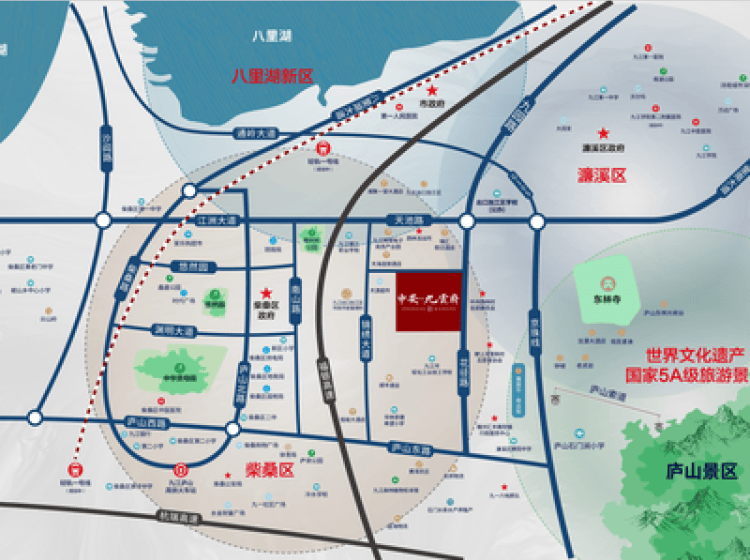 自驾:毗邻高铁站、环庐山轻轨、花径路高架城市快速路(规划中),105国道,昌九高速南出口