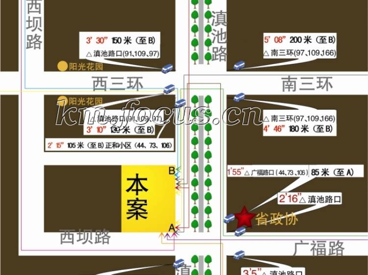 项目广福路、滇池路两条城市主要干道交叉口,是连接昆明老城和呈贡新城的交通要塞,交通网络十分通达,周边数十条交通路线。31、44、73、89、91、94、109、112、120、152、154、165、166等多路公交车。广福路、滇池路、十里长街、官南大道、海埂路、官南立交桥、福海立交桥、日新立交桥纵横交错,昆明国际机场、新南站、昆明火车站举步可达,项目到昆明市中心(金马碧鸡广场)仅仅20分钟车程,直线距离不到7公里。