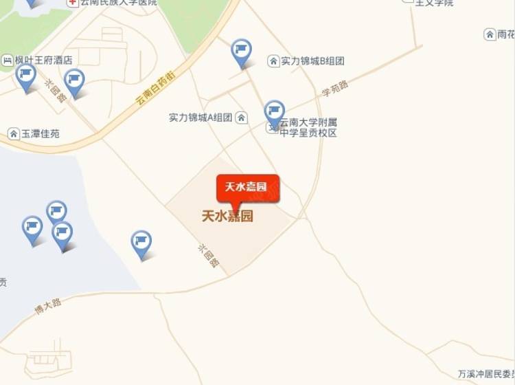 天水嘉园位于呈贡新区大学城,西靠云南大学,北临实力锦城及云南交通职业技术学院,东临云大附中、附小。项目占地面积235400平方米,建筑面积29825平方米,绿化率为45.02%,容积率为1.45。