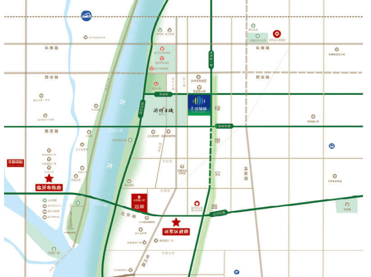 东侧依托临沂主题城市公园的绿带公园;西侧毗邻吃住行、游购娱一体的沂州古城繁华商业区、军部公园、滨河生态绿色长廊