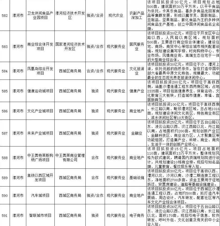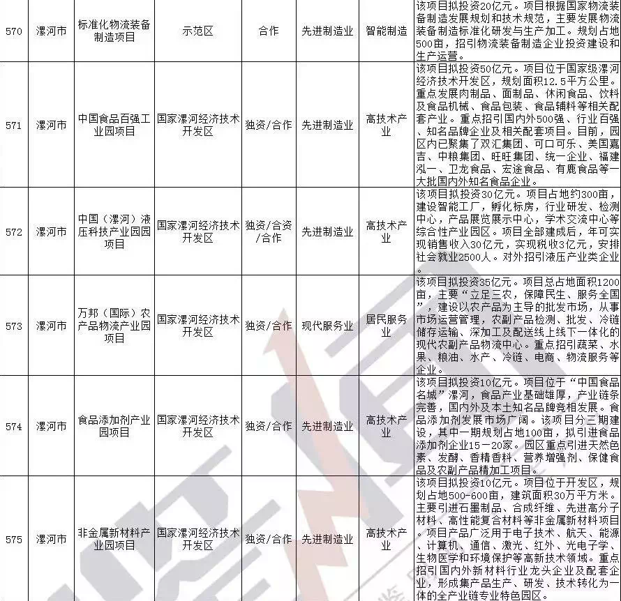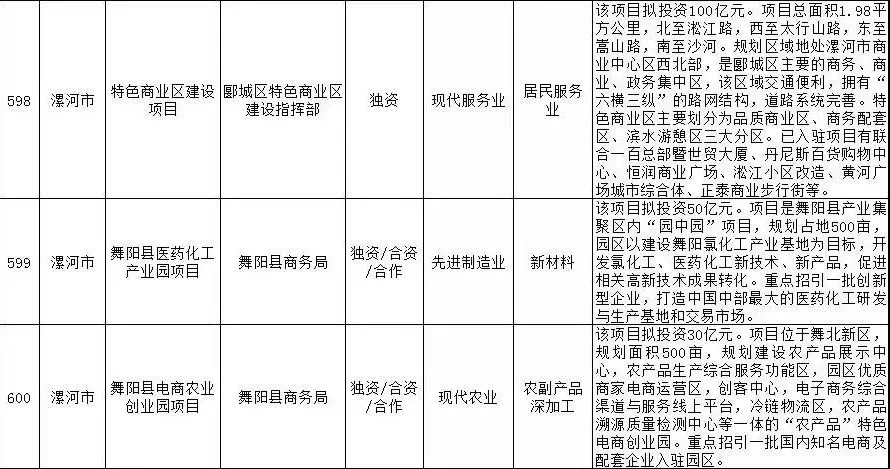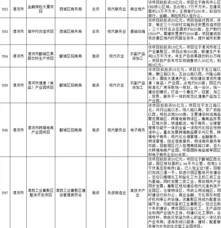 2019年漯河市重点招商引资项目名单