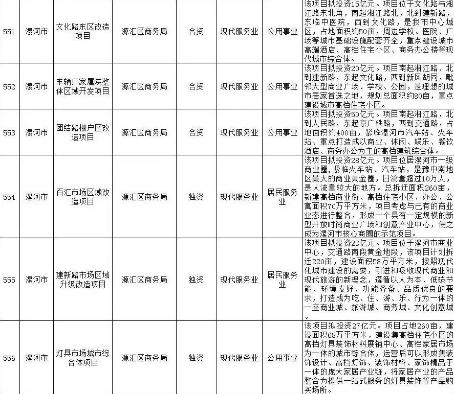 6.百汇市场区域改造项目:该项目拟投资28亿元。项目位居漯河市一级商业圈,紧临火车站、汽车站,是豫中南地区较大的商业黄金圈,日流量超过10万人,是人流量较大的地方。总拆迁面积260亩,新建高档商业街、高档住宅小区、办公、公寓面积70万平方米,项目考虑与已有的商业业态进行整合,形成一个具有一定规模的新型开放时尚商业广场和创意产业中心,使之成为漯河市核心商圈的示范项目。