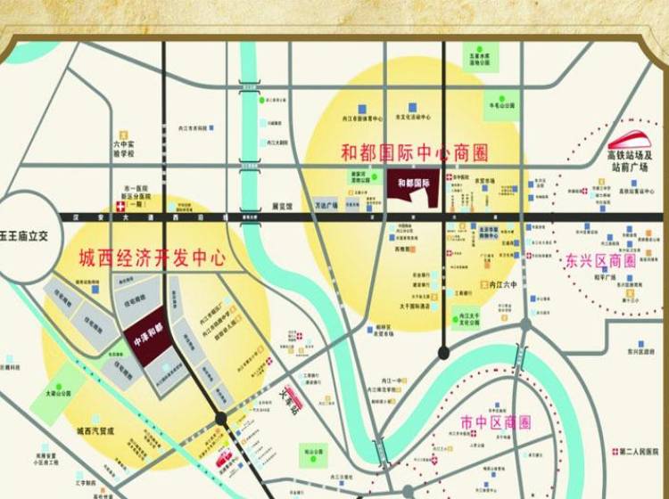 中泽·和都是由中泽集团继内江和都国际之后又一投资开发建设项目,该项目总投资额达11亿元,地处内江市城西组团开发区核心位置,北临新能源汽车配套;南临规划规划居住用地;东临规划居住用地;西临内江国际家居城。项目距市中心4.5公里左右,距离中心组团东兴区位置仅1-2公里,仅与连接东兴区的沱江四桥一桥之隔,与未来的高铁站口约3公里,周边公共设施较为完善,医院、学校、商业、客运站配套较为齐备1公里半径范围,汽车4S店、家居建材城、加油站、商业配套设施较为齐全。同时,项目周边汇集了英伦世家、松江一号、润江西岸等住宅区,已有正在建设的国际家居城、新能源汽车城,区域内大型企业较多,为项目后期快速形成人气、商气创造了有利的条件。