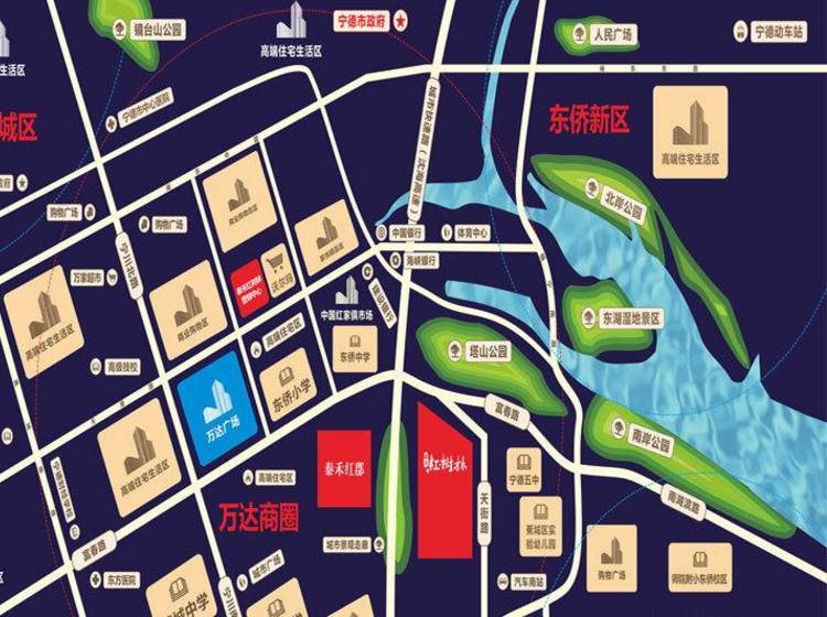 商业:万达、沃尔玛、IMAX影院、大型百货、超市、餐饮、购物广场 公园:塔山公园,南岸公园、北岸公园 学校:东侨小学、东桥中学、宁德五中、蕉城区实验幼儿园 银行:工商银行、建设银行、中国银行、海峡银行 医院:宁德明仁医院、、东方医院 社区商业、网球场 、星级泳池、泛会所