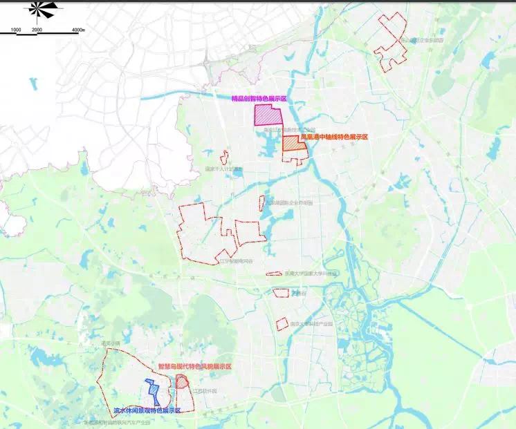 本规划划定4个特定意图区,分别为百家湖片区的凤凰港中轴线特色展示区、胜太路精品创智特色展示区和江苏软件园的智慧岛现代特色风貌展示区、滨水休闲景观特色展示区。