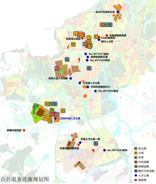 学校商业:规划小学1处,幼儿园4处。规划新建党校、文化设施、商业服务设施等,其中商业服务业设施主要位于百家湖片区、江苏软件园片区和东山片区。