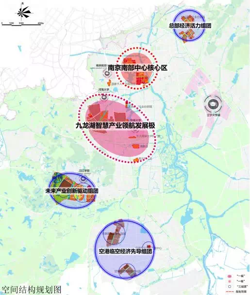 三组团:江苏软件园片区打造未来产业创新驱动组团,空港片区打造空港临空经济先导组团,东山片区打造总部经济活力组团。