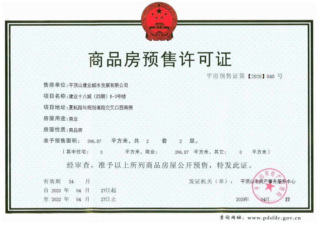 - 平房预售证第【2020】039号 详情发证时间 2020-04-27绑定楼栋建业十八城(四期)B-1号楼证件照片
