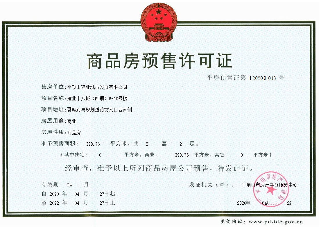 - 平房预售证第【2020】043号 详情发证时间 2020-04-27绑定楼栋建业十八城(四期)B-10号楼证件照片