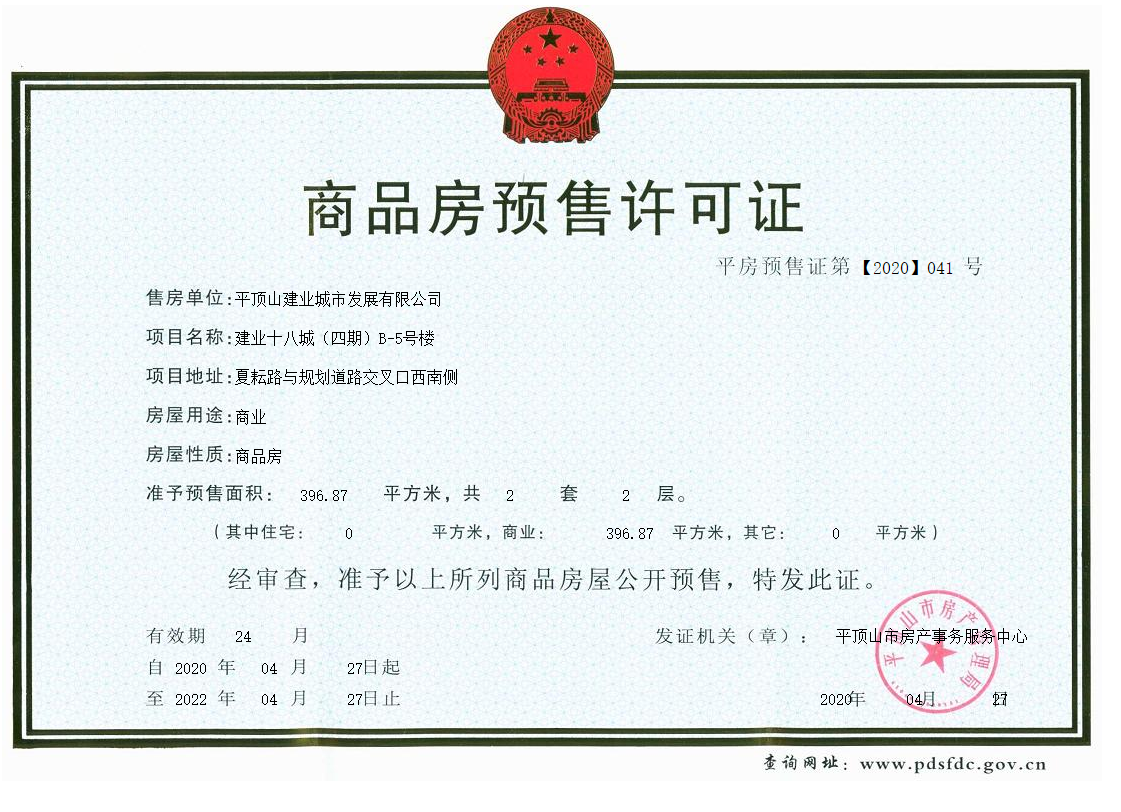 - 平房预售证第【2020】041号 详情发证时间 2020-04-27绑定楼栋建业十八城(四期)B-5号楼证件照片