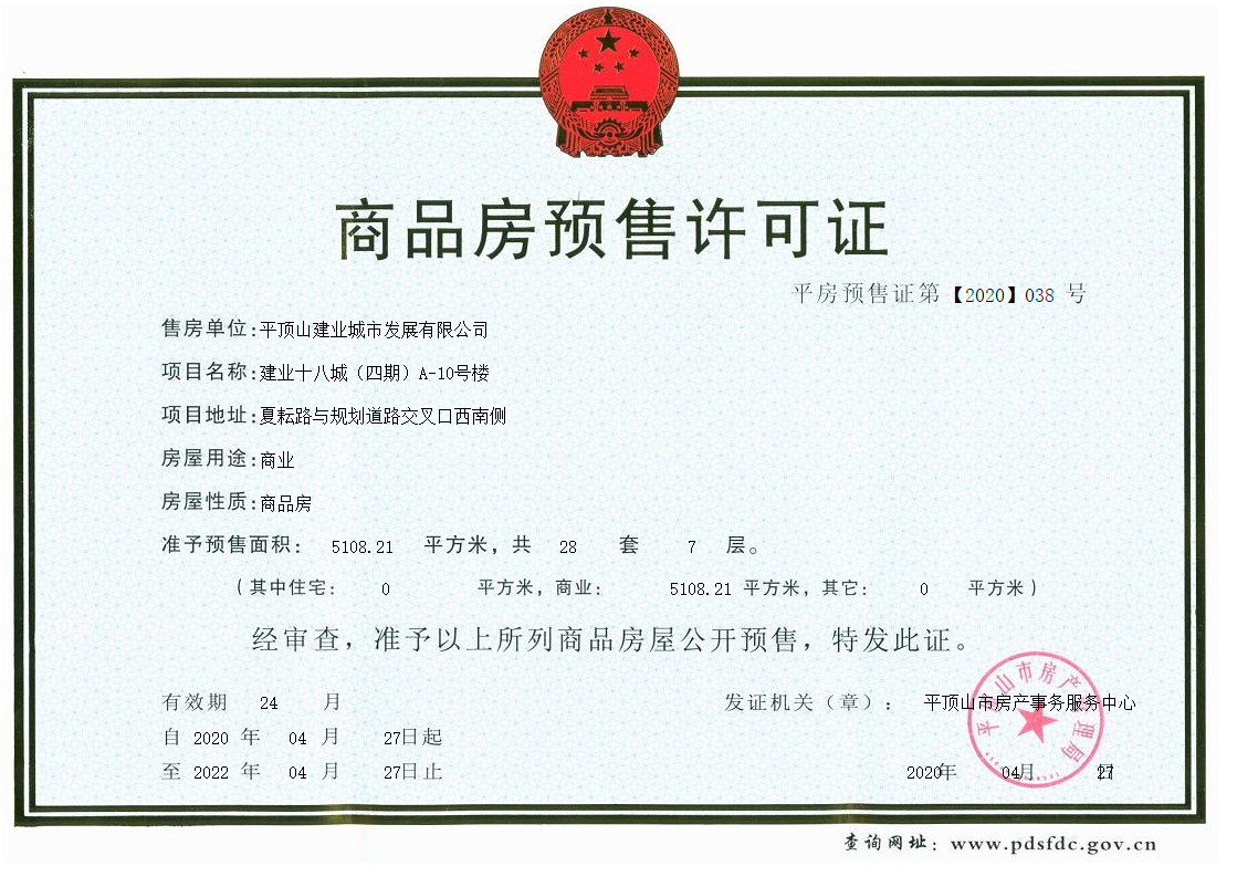 - 平房预售证第【2020】038号 详情发证时间 2020-04-27绑定楼栋建业十八城(四期)A-10号楼证件照片
