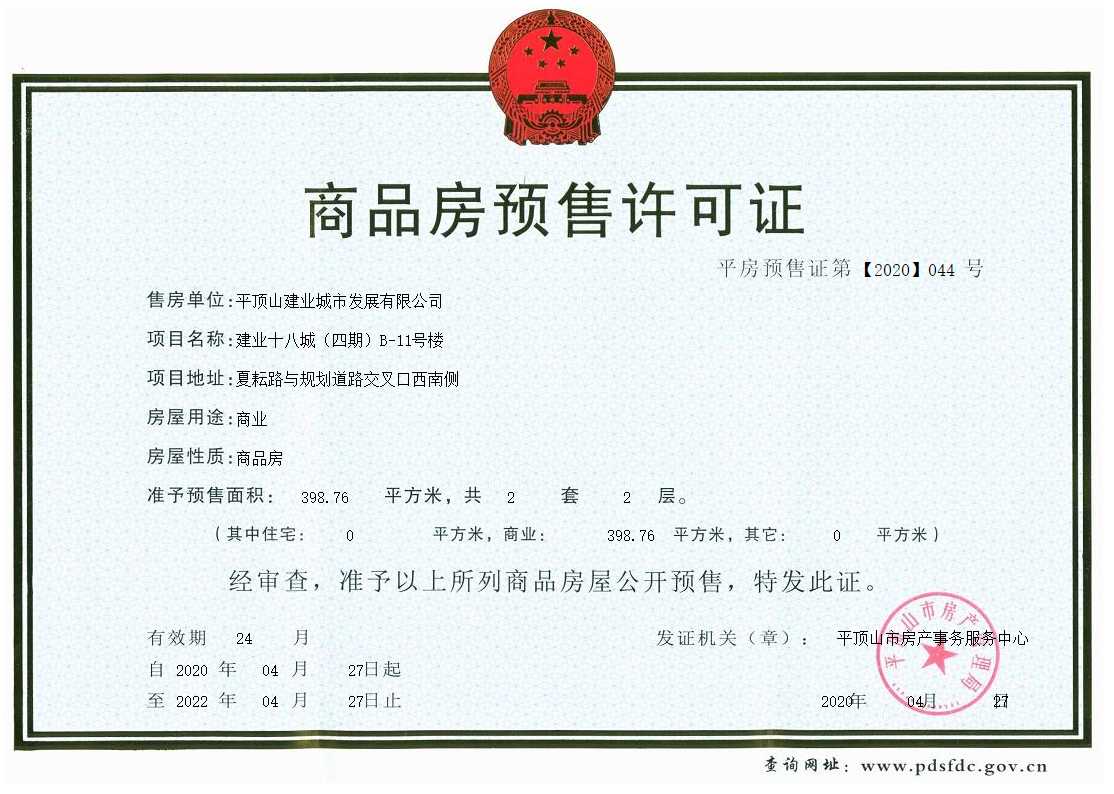 - 平房预售证第【2020】044号 详情发证时间 2020-04-27绑定楼栋建业十八城(四期)B-11号楼证件照片