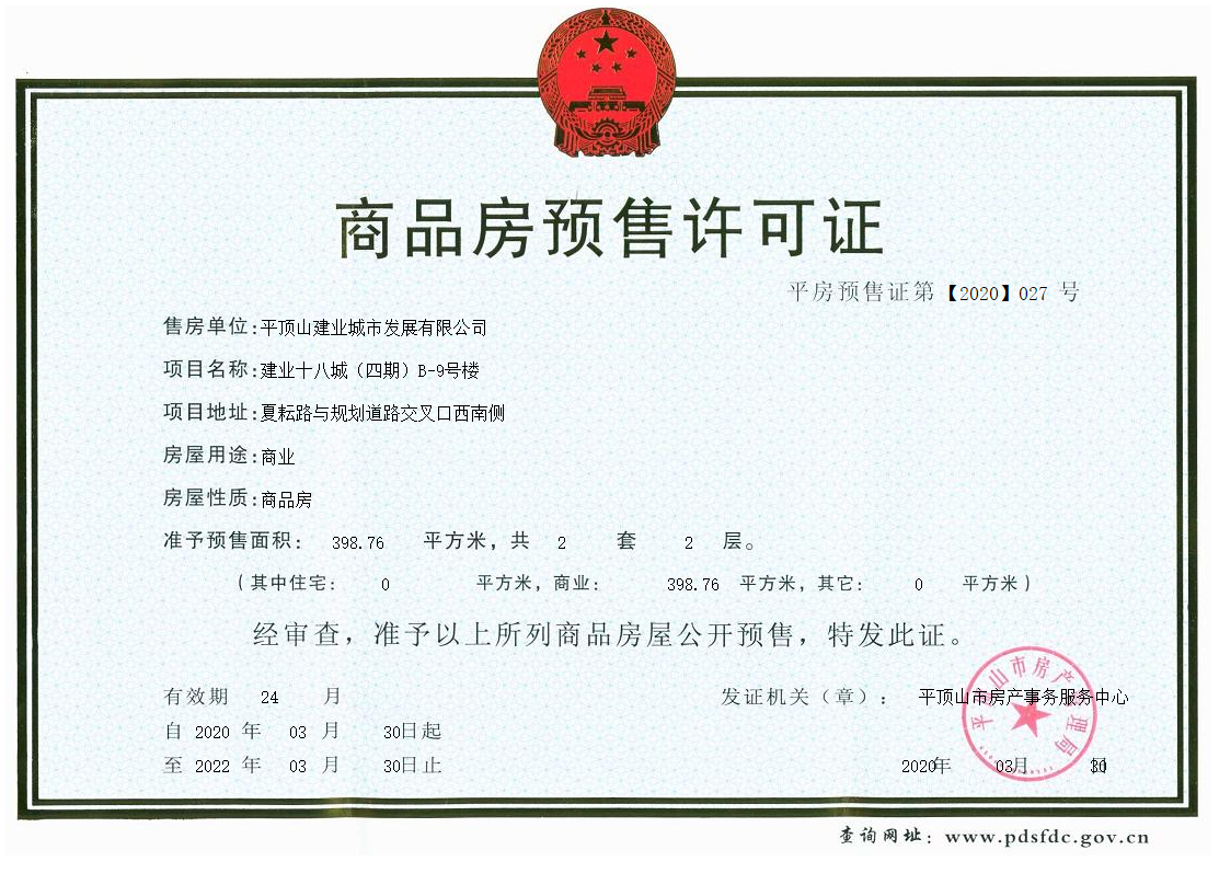 - 平房预售证第【2020】027号 详情发证时间 2020-03-30绑定楼栋建业十八城(四期)B-9号楼证件照片