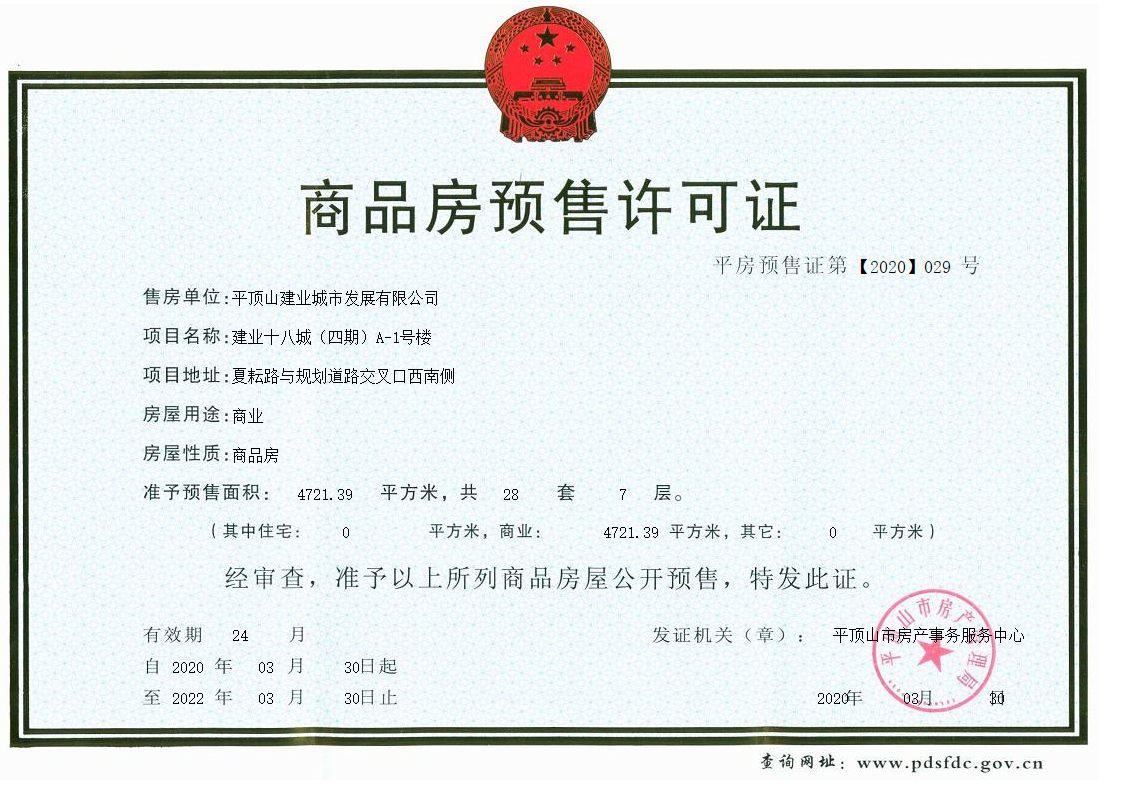 - 平房预售证第【2020】028号 详情发证时间 2020-03-30绑定楼栋建业十八城(四期)A-6号楼证件照片