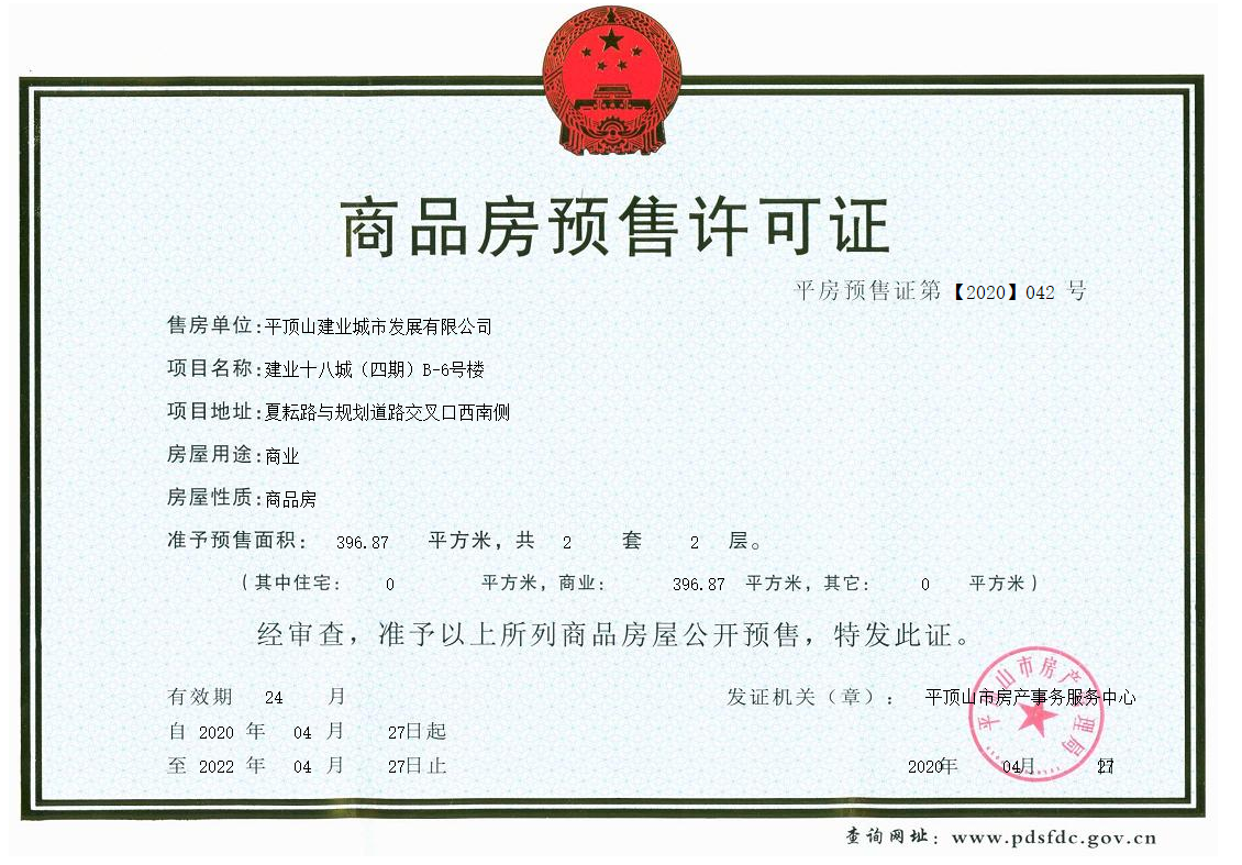 - 平房预售证第【2020】042号 详情发证时间 2020-04-27绑定楼栋建业十八城(四期)B-6号楼证件照片