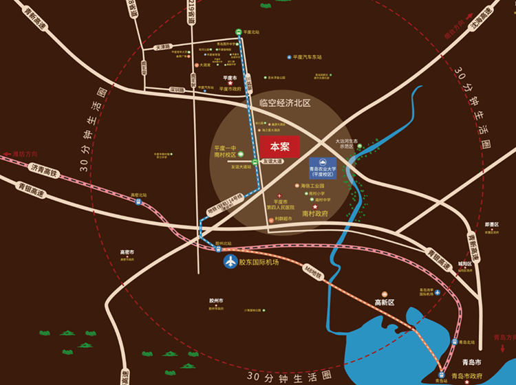 距离平度主城区约22公里,青新高速20分钟即达。项目离胶东新机场20公里,沈海高速仅需20分钟。项目距流亭机场约40分钟车程。项目距离青岛核心圈60公里,青新高速仅需50分钟。