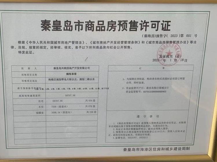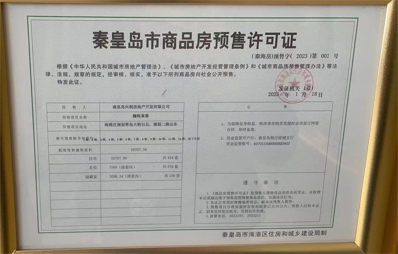 - (秦海房)预售字(2023)第001号 详情发证时间 2023-01-18绑定楼栋预售楼栋:1-12栋、地下车库 住宅建筑面积58707.96平方米,共434套; 车位建筑面积7568平方米(按套内),共576套; 储藏室建筑面积3098.34平方米(按套内),共256套;证件照片