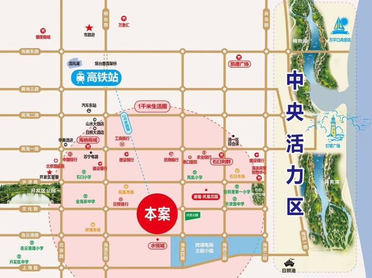 万德新城(公交站):44路;日照银行石臼支行(公交站):14路;20路;44路;铁路疗养院(公交站):14路;19路;20路;43路;C507路;海洋世家(公交站):44路;凤凰小学(公交站):14路;19路;20路;43路;C507路;锦华海岸(公交站):22路;海滨五路上海路(公交站):31路;凤凰花园(公交站):22路;小滩(公交站):14路;20路;31路;中煤花园(公交站):19路;43路;5路内环;5路外环;