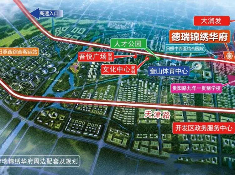 德瑞锦绣华府,位于大连路与兖州南路交会处,北接大润发核心商圈,尽享城市既成繁华;恰处开发区生态科技城东北,2022年省运会体育中心、贵阳路九年一贯制学校(规划中)、中西医医院(规划中)等生活配套近在周边,新城日新月异,承揽城市美好未来;向西直达日照立体综合交通港,日照西综合客运站、高速出入口、机场高速等,定义城市加速度。项目规划为26栋多层电梯洋房、高层、小高层产品,配部分沿街商铺,一栋3300㎡社区幼儿园。95-140㎡的户型设计,全明通透,大面宽、短进深,H户型为主,双阳台、多飘窗,更多阳光、更多鲜氧,更舒适的居住选择。