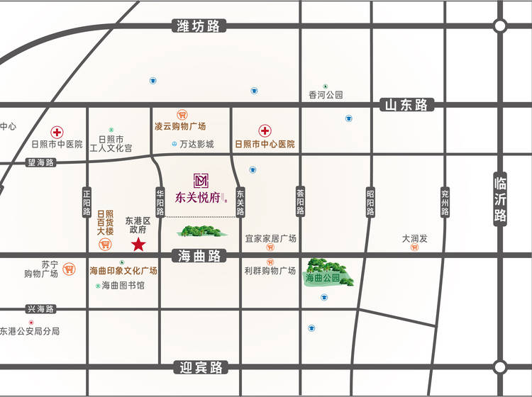 苏宁广场、利群购物广场、百货大楼、荣安广场、太阳城等核心商圈,日照市中医医院、日照市中心医院两所市重点医院,教育、医疗等资源汇聚,打造1公里全功能生活圈,近享万千繁华