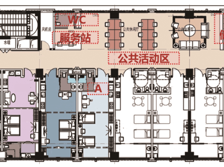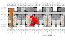 一期建筑面积3.01万㎡,地上共24层2.9万㎡,其中-1层生活物品平价超市,1-2层为医保配套药店,3-4层为老年娱乐乐活空间,5-6层医康母婴,10层为医康介护,12层为医康康复,24层为营养餐厅,25层为空中花园。7-11层、13-23层为适老化精装修颐养公寓,每层建筑面积1100㎡,每层14户,共254户。