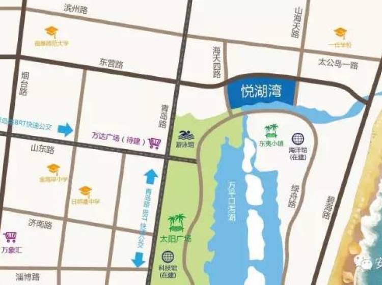 安泰·悦湖湾项目位于青岛路以东、东营路以南、山海天路以西,地处泄湖北岸,拥有优质的水景资源优势。前排别墅项目将于湖亲密接触,而后排的洋房和高层将可实现南瞰泄湖东看黄海。