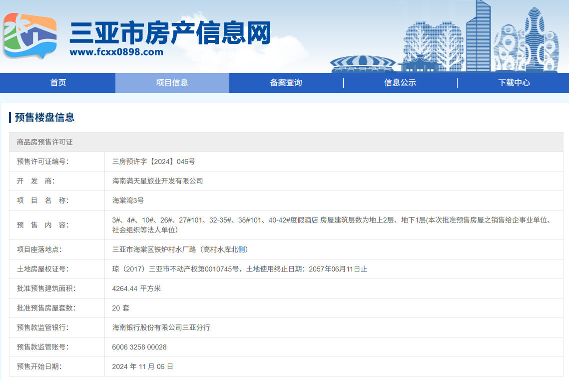 - 三房预许字〔2024〕39号 详情发证时间 2024-09-25绑定楼栋批准海棠湾3号C7-02-04地块项目(产权式酒店)主体酒店预售,房屋建筑层数为地上6层(本次预售房源:2层201—214,3层301—316,4层401),批准预售建筑面积2813.62平方米,套数31套。证件照片