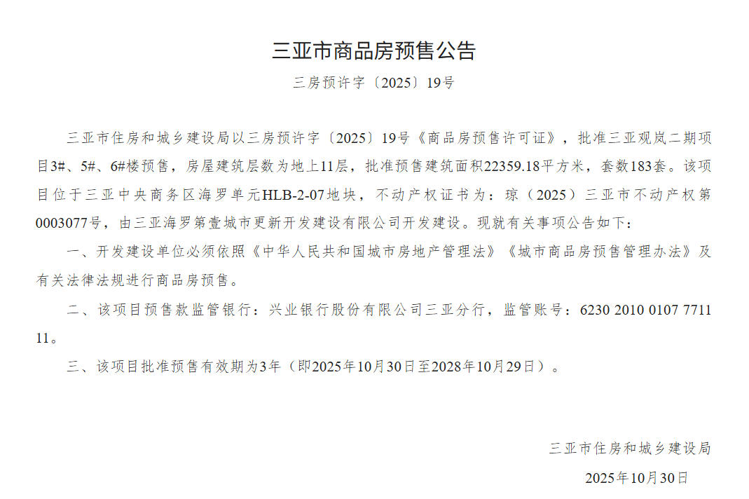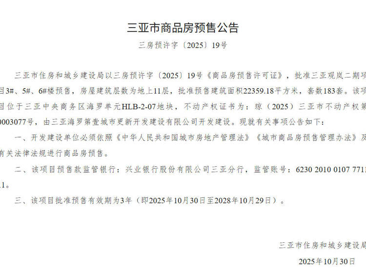 - 三房预许字〔2025〕19号 详情发证时间 2025-10-30绑定楼栋批准三亚观岚二期项目3#、5#、6#楼预售,房屋建筑层数为地上11层,批准预售建筑面积22359.18平方米,套数183套。证件照片