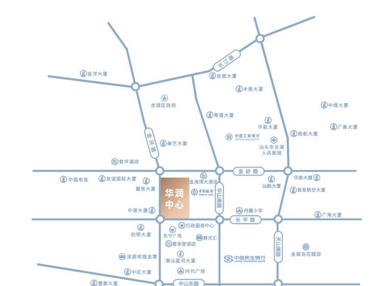 位于汕头市龙湖区原南国商城地块,扼守金砂路、金环路、长平路三大城市交通主动脉,周边集聚全市约70%以上甲级写字楼、约80%以上金融机构、约75%以上政府机关,商务圈与商贸圈双圈聚合