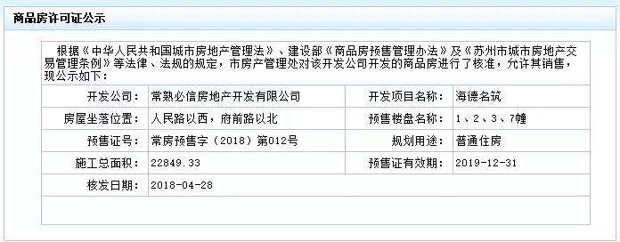 就在昨天(4月28日),海虞纯新盘海德名筑获得预售,预售证号:常房预售字(2018)第012号。