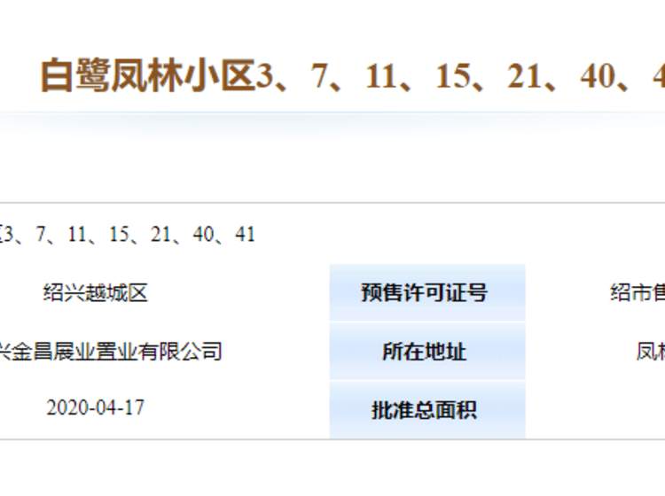- 绍市售许字(2020)第00089号 详情发证时间 2020-04-17绑定楼栋白鹭凤林小区3、7、11、15、21、40、41证件照片