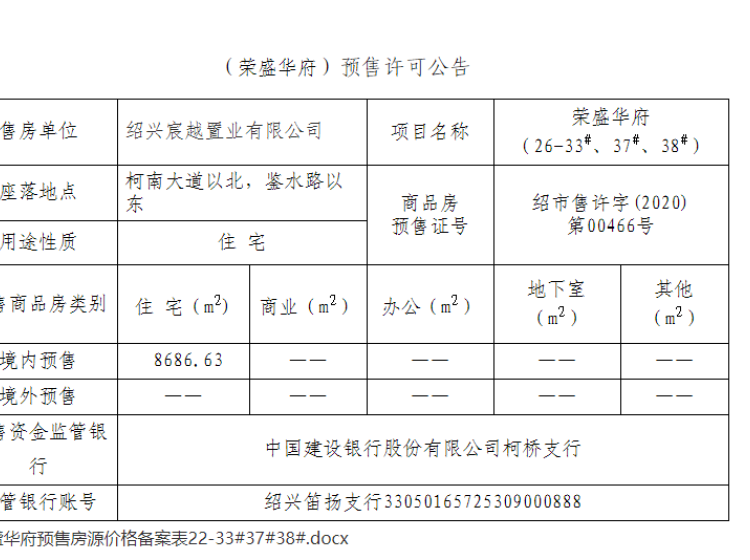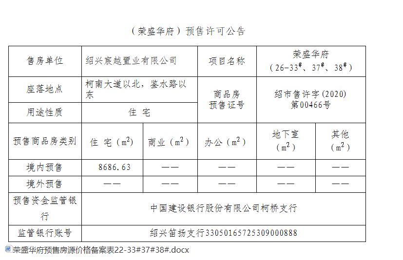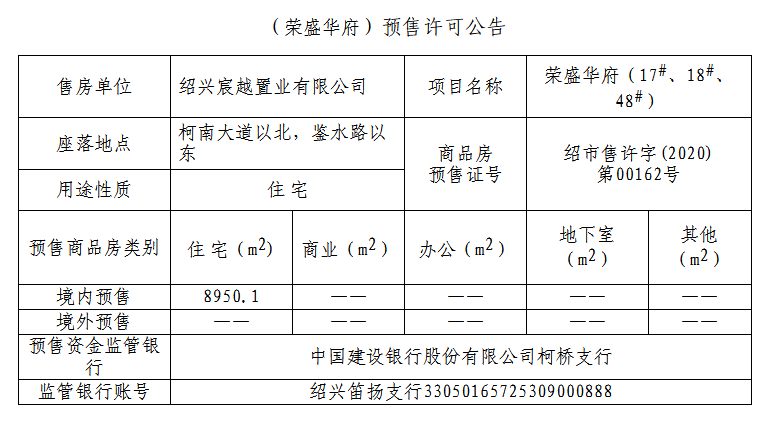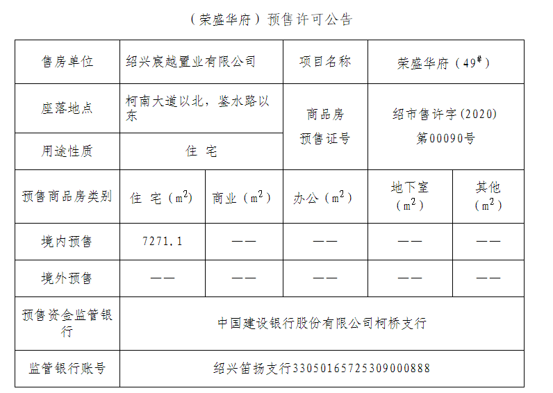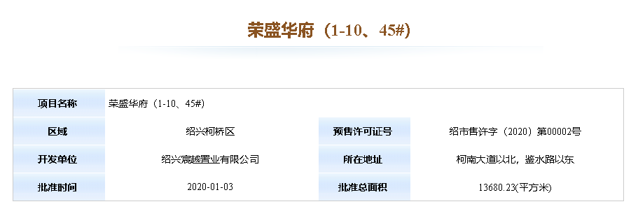 - 绍市售许字(2020) 第00217号 详情发证时间 2020-06-23绑定楼栋荣盛华府(40#-43#、46#)
