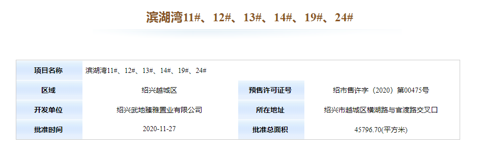 - 绍市售许字(2020)第00475号 详情发证时间 2020-11-27绑定楼栋滨湖湾11#、12#、13#、14#、19#、24#证件照片