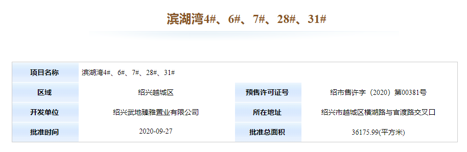 - 绍市售许字(2020)第00381号 详情发证时间 2020-09-27绑定楼栋滨湖湾4#、6#、7#、28#、31#证件照片