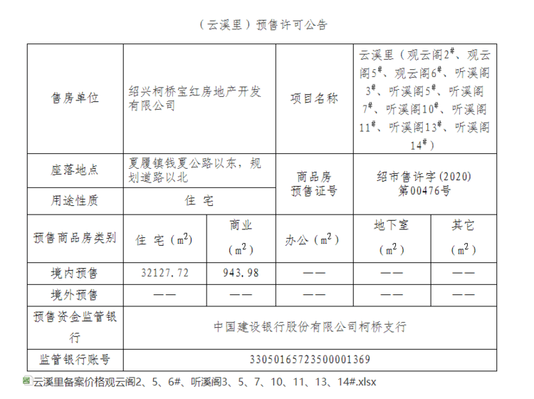 - 绍市售许字(2020) 第00476号 详情发证时间 2020-11-27绑定楼栋云溪里(观云阁2#、观云阁5#、观云阁6#、听溪阁3#、听溪阁5#、听溪阁7#、听溪阁10#、听溪阁11#、听溪阁13#、听溪阁14#)证件照片