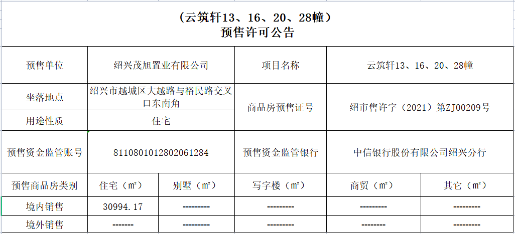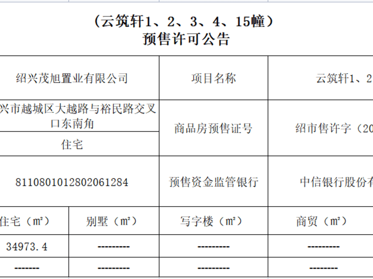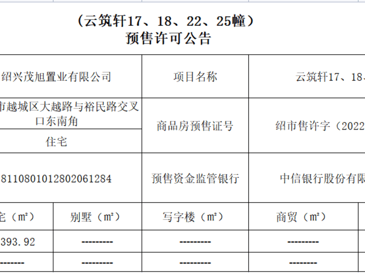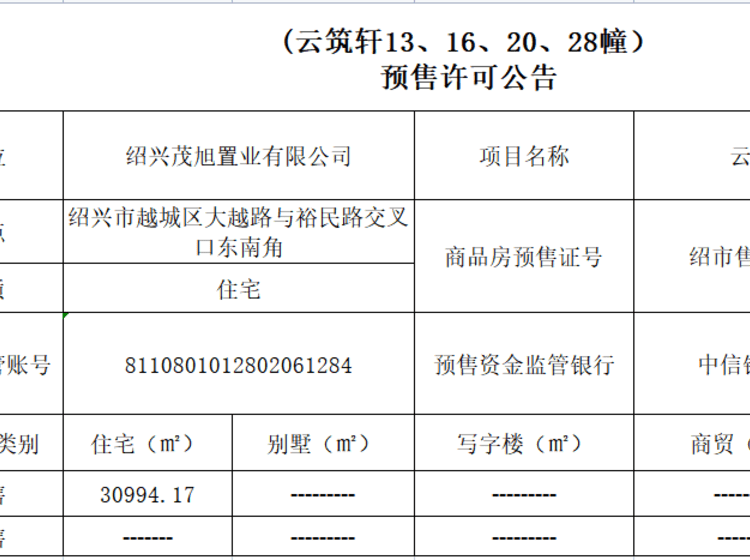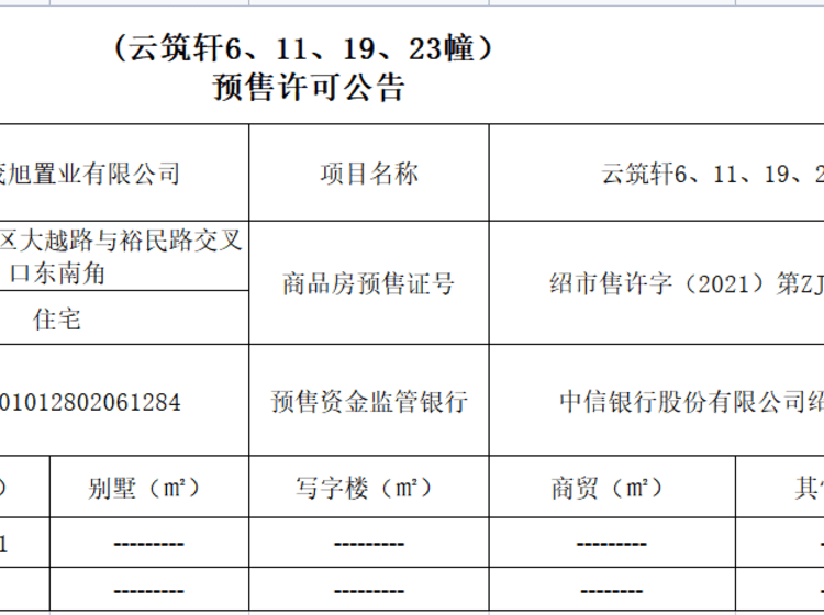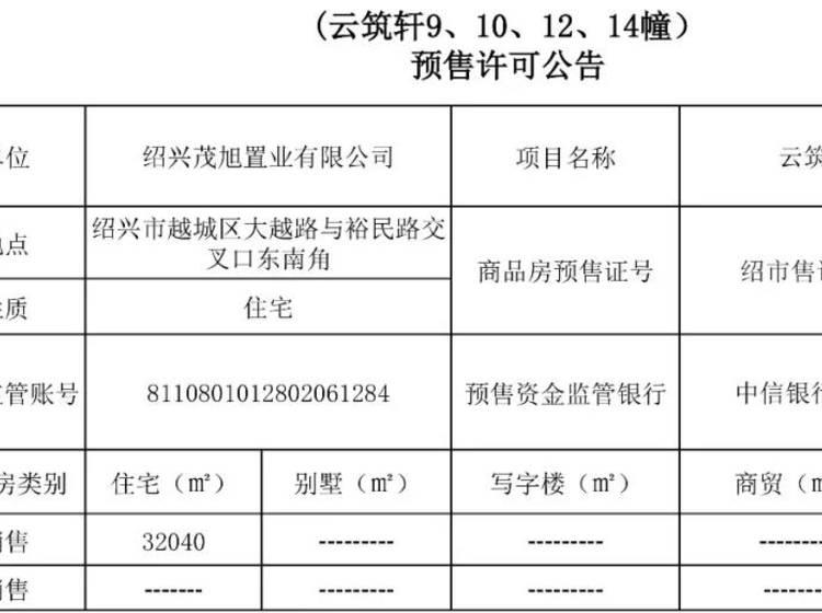 - 绍市售许字(2020)第00458号 详情发证时间 2020-11-13绑定楼栋云筑轩(9#、10#、12#、14#)证件照片