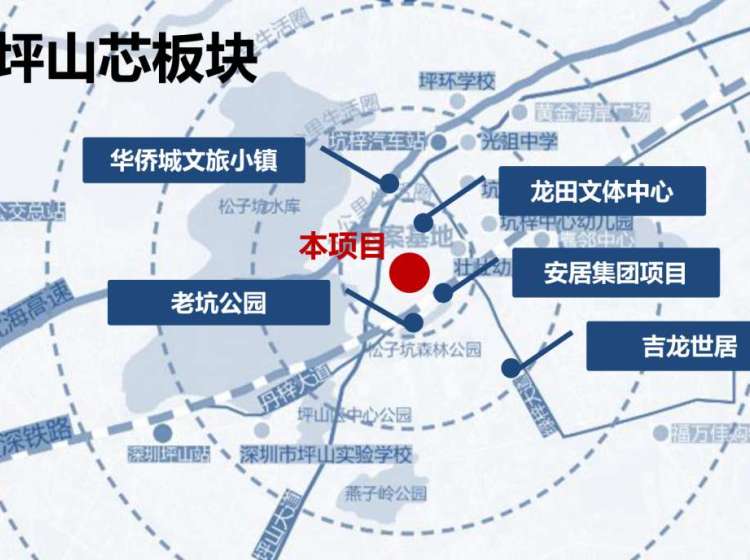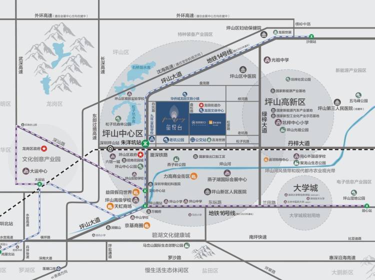 其他:坪山中心文化综合体“六馆一城”、聚龙山生态公园、松子坑森林公园、坪山中心公园、老坑文化公园、龙田文体中心(在建)、华侨城文旅小镇(在建)、惬享城市绿肺上的自然生态。