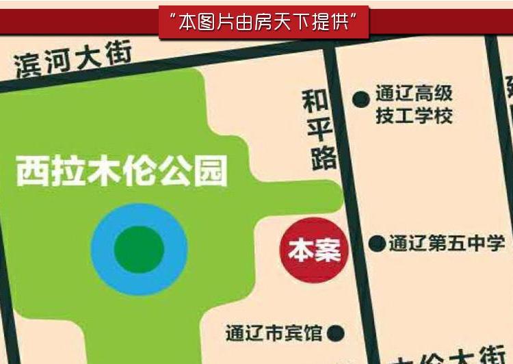 本项目位于通辽市和平路北段,与通辽五中学隔街相望。该项目在通辽市繁华地段,项目周边商街林立,周边商业中心大润发超市、沃尔玛商业中心都很近,步行即可,让居住在这里的人们生活购物无忧,生活方面项目北侧有中国银行和工商银行,南侧是农业银行和建设银行、内蒙古银行等,都分布在项目周围,交通也非常便利,888路、27路公交贯穿新城区和老城区,让您出行无忧。通辽市附属医院、市医院也分别在项目的东边和南边。所在区域道路通达、公交便捷,是主城连接桥北的枢纽地带,丰富的城市配套资源将赋予业主雍容的都市生活体验。 与项目接壤的西拉木伦公园,占地40万平方米是通辽市中心的开放式公园,核心的城市景观带,公园里有健身器材区、儿童游乐区、花卉观赏区、中央景观马头琴、喷泉瀑布水系区、还有西拉木伦公园的中心湖心区等等,可以说西拉木伦公园是项目园区的延展,业主家居的后园,森林湖泊、亭榭花树、推窗揽胜,为城市增添了一道亮丽的风景的同时,更多的为忙碌的人们提供了健身休闲的城市绿地公园。空气的湿度和负氧离子都非常充足,是一个天然的绿色氧吧,呼吸到公园里新鲜的空气,感受绿树、阳光、鸟语花香。是不可复制的景观资源,更能收获仅有的健康生活模式。项目往北就是辽河水上公园,公园里的水上乐园、篮球、足球、羽毛球等的场地都能让孩子有一个健康快乐的童年,辽河公园是通辽市政府近年来花巨资打造的,辽河两边的彩虹桥和建国桥都是通辽的标志性景观和建筑。